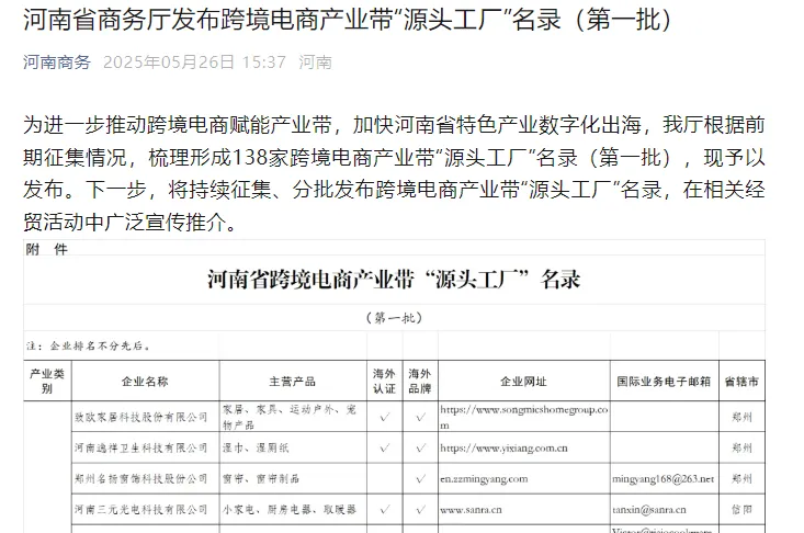 2025 年 5 月 26 日,河南省商務廳正式發(fā)布第一批河南省跨境電商產(chǎn)業(yè)帶 “源頭工廠” 名錄,河南天曼服飾有限公司成功入選,成為全省服裝行業(yè)跨境電商領域的標桿企業(yè)。