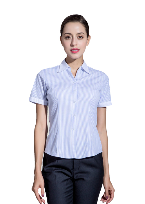 品名:女短袖V領(lǐng)襯衣;版型:修身版;貨號(hào):TWD6001 ;面料:T6001;顏色:藍(lán)豎條紋白領(lǐng)白袖口 ;Fabric:C60/T40/80/2*45S